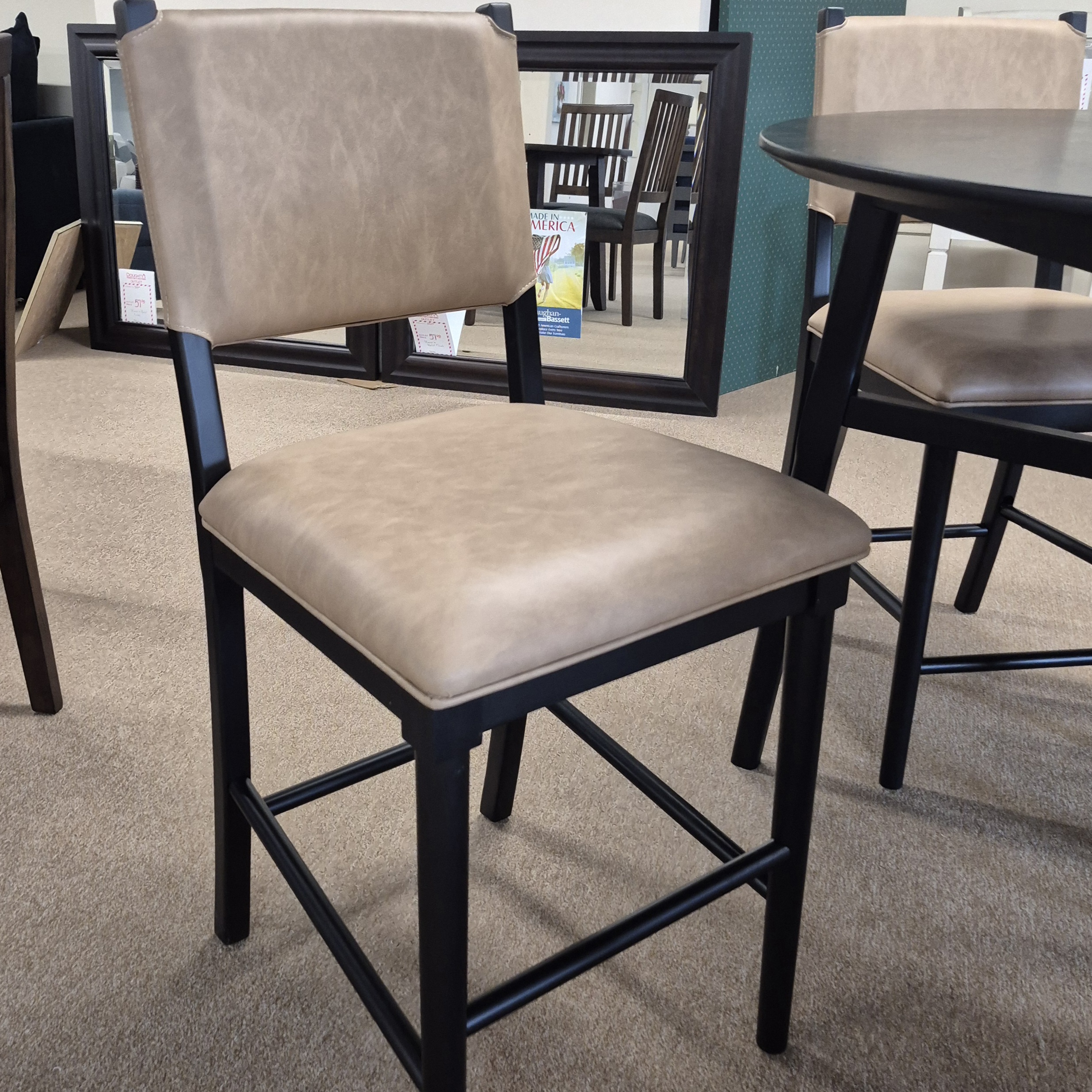5 Piece set includes: 46″ Round counter height table & 4 counter height stools in tan vegan leather.