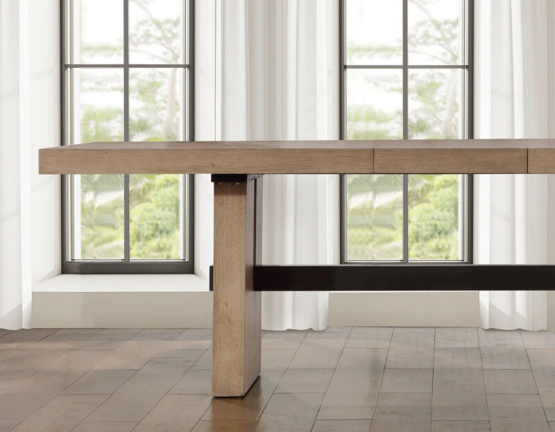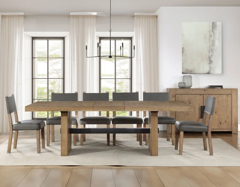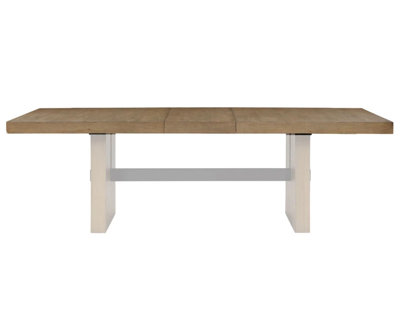 The 78-96″ long Aubrey Table Top helps form the foundation of the Aubrey Dining Table. Finished in a lustrous waxed driftwood, this top expands from 78 inches to 96 inches with the addition of the included 18-inch leaf to seat up to ten guests. Quickly go from intimate to inclusive with a quick table conversion and keep the atmosphere going. Modern, clean but with a touch of rustic, thanks to the wire brushing finish technique, this top adds a beautiful centerpiece to any dining room.