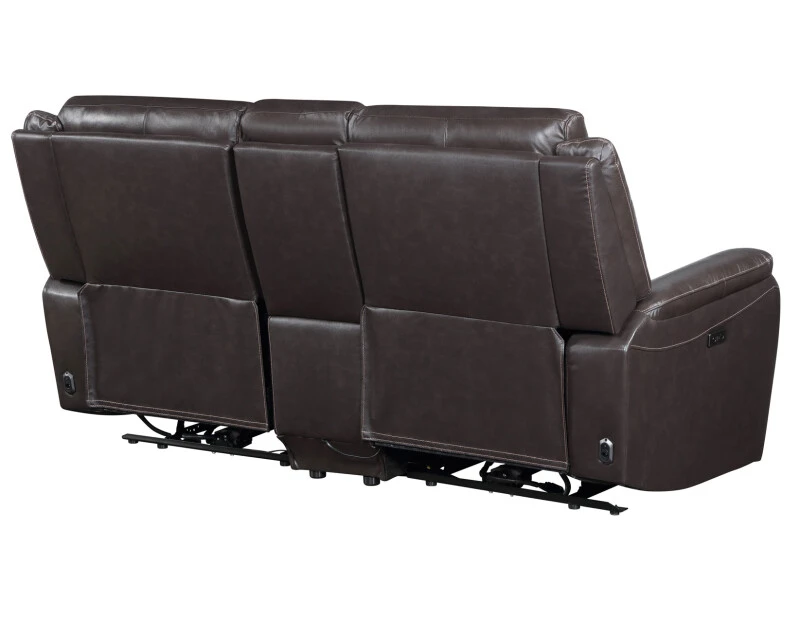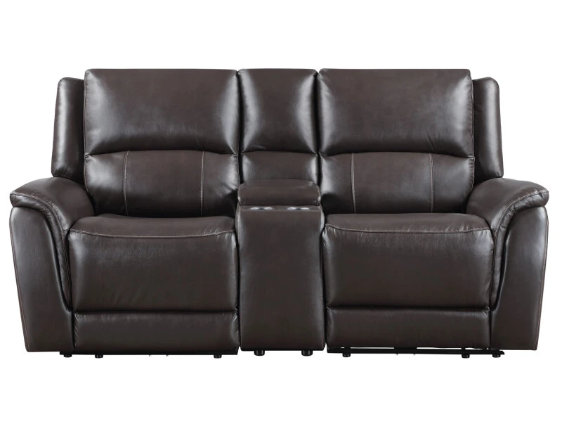 Embrace refined comfort with the Alexandria Leather Reclining Console Loveseat. Upholstered in warm, versatile Chocolate leather, it complements any décor with understated elegance. Enjoy a 143-degree power recline that works efficiently with just 3″ of wall clearance. Plush 7-inch cushions provide deep, supportive seating, while the center console adds practical storage. Stay connected with built-in USB ports. Designed for style and function, this loveseat brings modern convenience and timeless comfort together in one beautifully crafted piece.