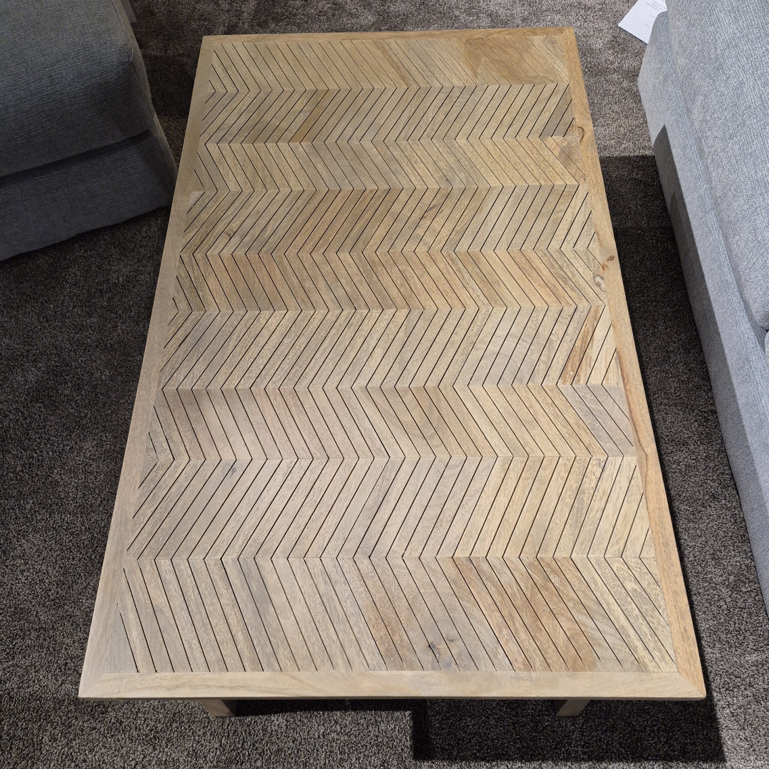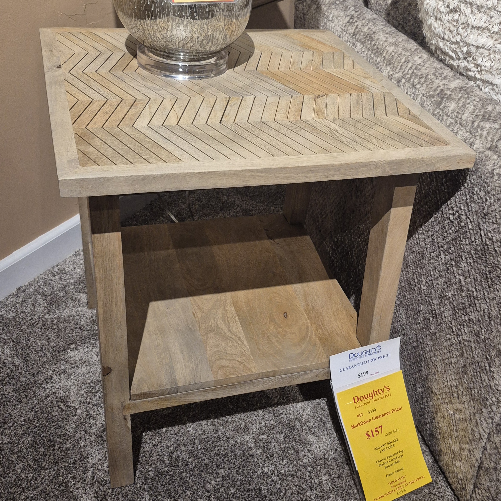 2 Piece Set Includes: Rectangular cocktail table & square end table with chevron patterned top, modern canted legs & bottom shelf in a natural finish.