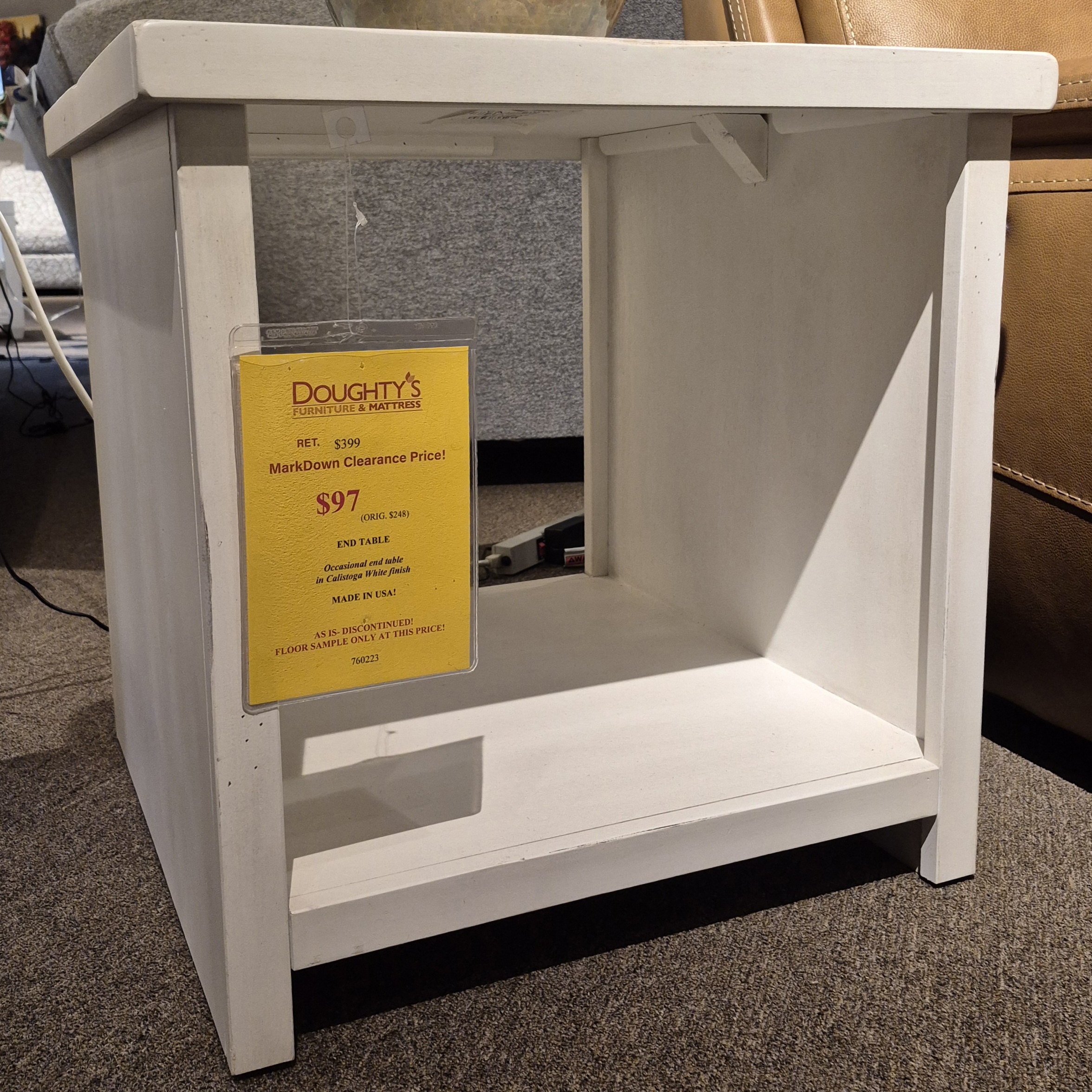 Occasional end table with fixed shelf in Calistoga white finish.